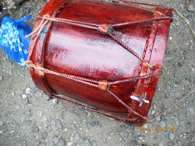 Above pictures are traditional drums used in Piddig. The body is made of solid Narra (Philippine Mahogany) carefully carved to a specific thickness - 1/4 inch for a specific sound. Accordingly, carving would take a month since they do it manually. Th drum face (cover) is made of an aborted calf's skin so it is paper thin and strong. The two strings determine the sound quality depending on its tightness.